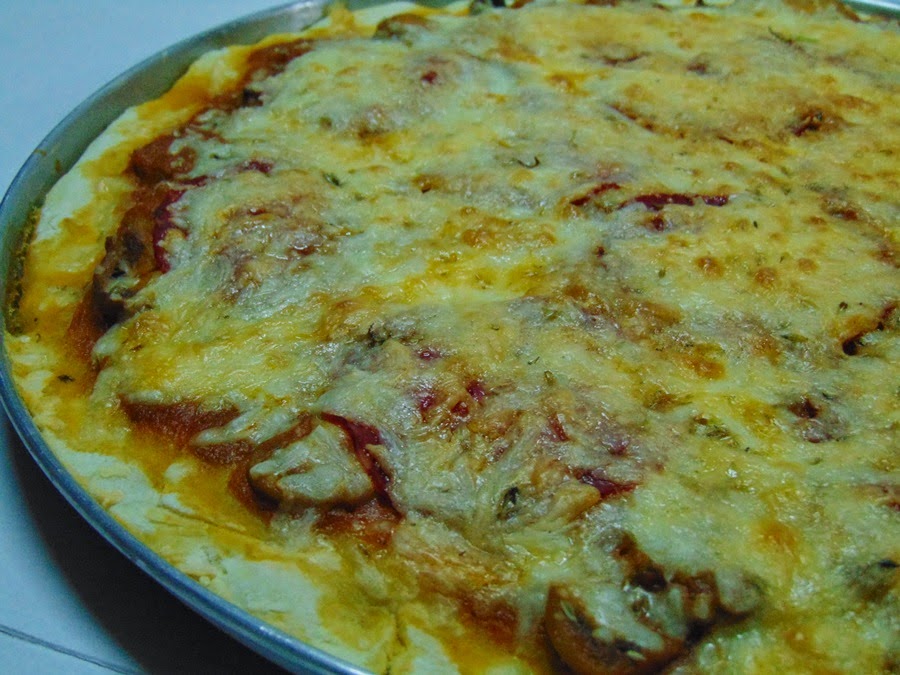 Na piza da foto usei molho de tomate próprio para pizzas, 1 lata de cogumelos laminados, umas rodelas de chourição, polvilhei com queijo mozzarela e uma pitada de orégãos, muito simples e saborosa.